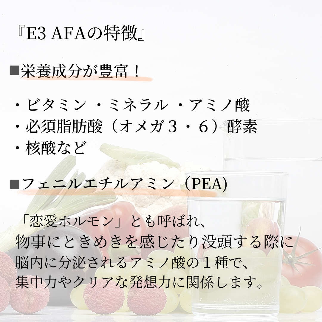 理想的な比率でアミノ酸が含まれている他、神経伝達物質フェニルエチルアミン(PEA)が含まれてますいるため、多忙な日常で多くのストレスにさらされている現代人に嬉しい集中力やクリアな発想力に対して嬉しいアミノ酸を配合しております。