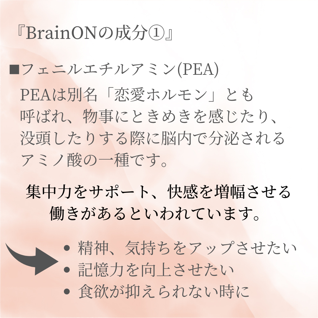 BrainONは特に異好を好む、物事に集中するときに脳内で秘密にされるアミノ酸の種類であるフェニルエチルアミン(PEA)を含んでおり、