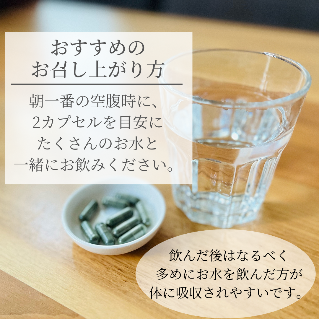 朝一番の空腹時に、2カプセルを目安にたくさんのお水と一緒にお飲みください。