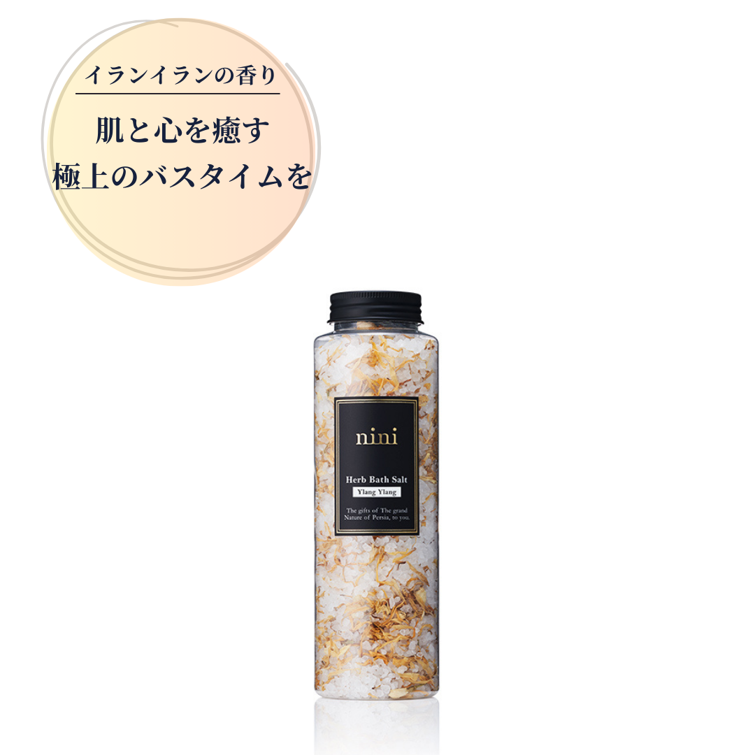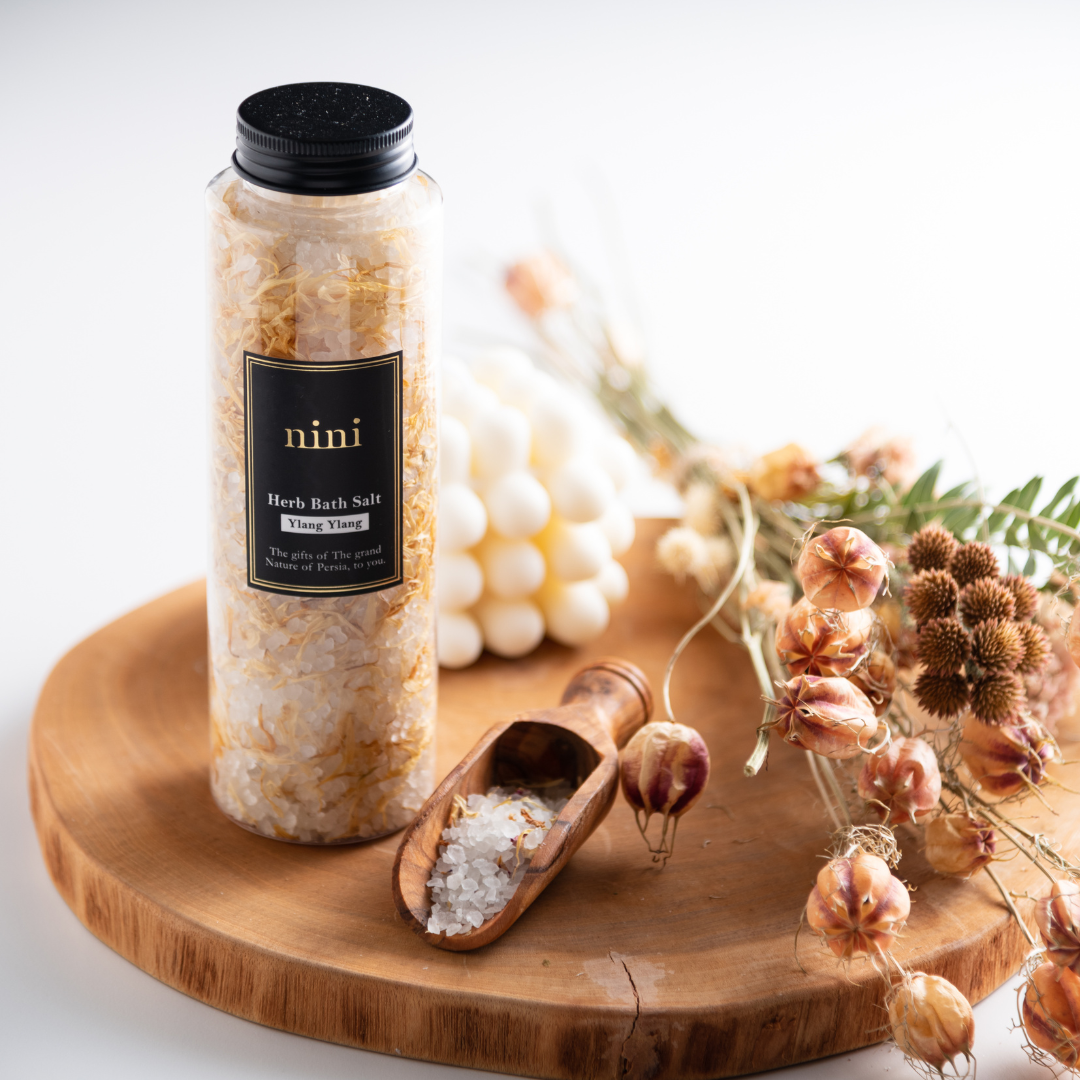 nini ハーブバスソルトは、この貴重な天然塩をベースに、日本人の繊細な肌に合わせた100%ナチュラル処方。湯船に溶かせば、天然ミネラルと心地よい温浴効果とともに肌をやさしく包み込み、しっとりなめらかに整えます。