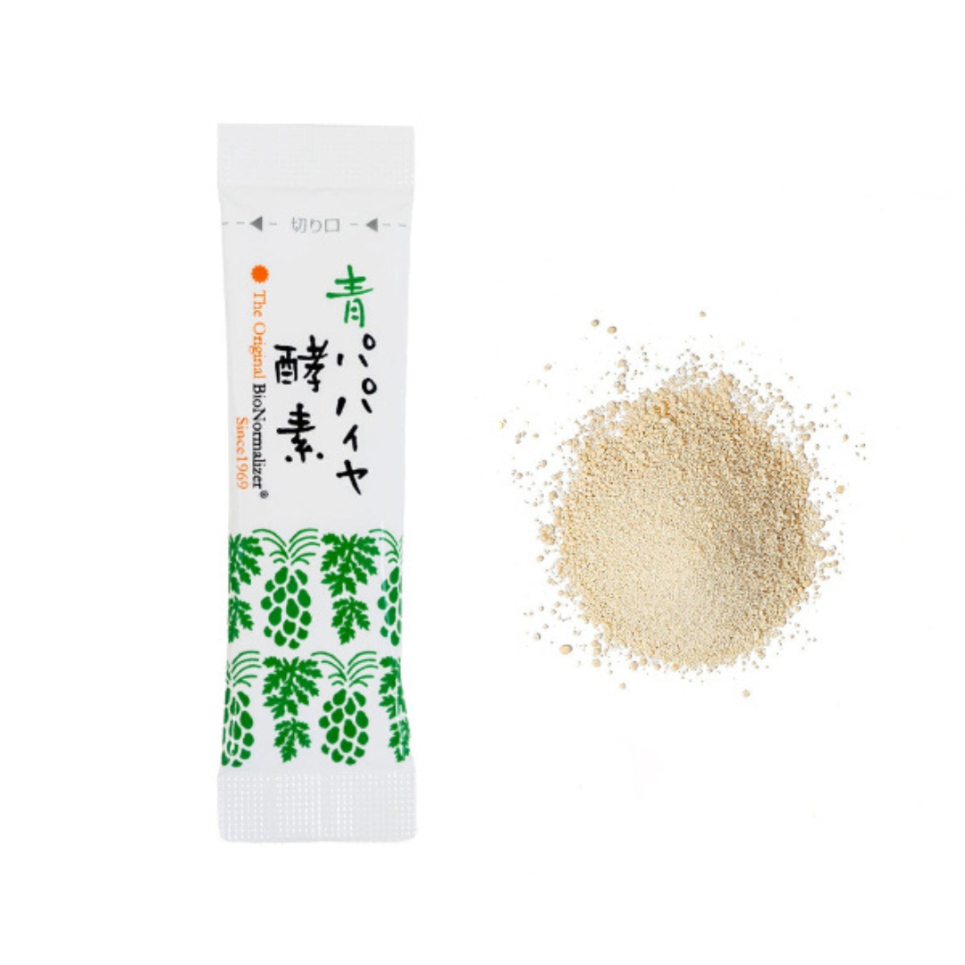自社有機農園で育てた未成熟の青パパイヤを満月に収穫し、皮・実・種まですべてを独自の酵母で発酵。酵素含有量は果実の約4倍。携帯に便利なスティックタイプで、毎日の美と健やかさを手軽にサポートします。