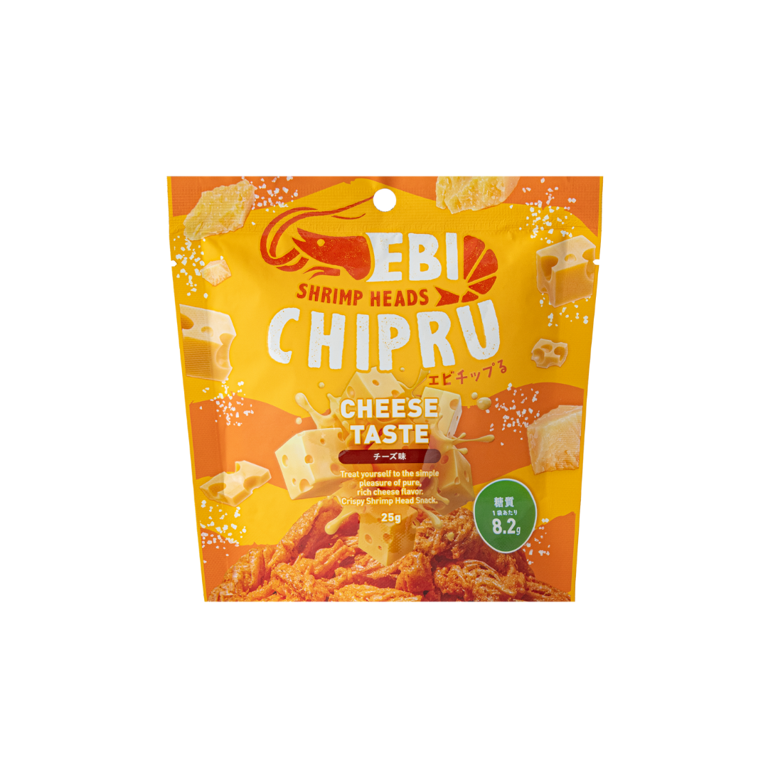 主原料は廃棄ロスになっていたエビの頭(頭胸部)。素材そのままを揚げた、栄養価が高く地球・カラダにやさしいヘルシー&エシカルスナック。エビチップるは、エビの香ばしさを引き立てるカリっと食感とカルシウム(牛乳200mlの約2.6倍)が特徴。エビの旨味と濃厚チーズの至極ハーモニー。
