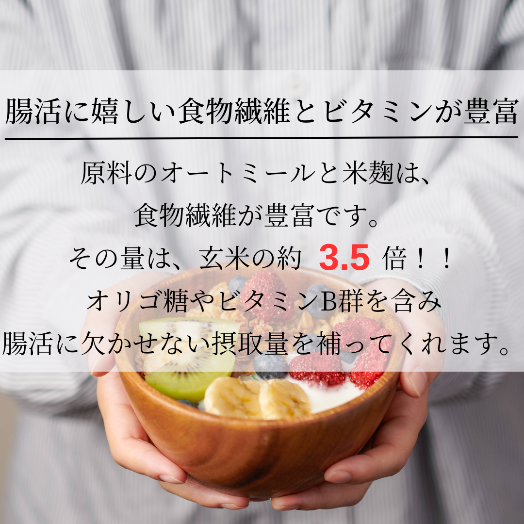 「糀×オートミール」の組み合わせは食物繊維が豊富で腸活に最適と言われており、ナチュラルな原材料のみで作られます。