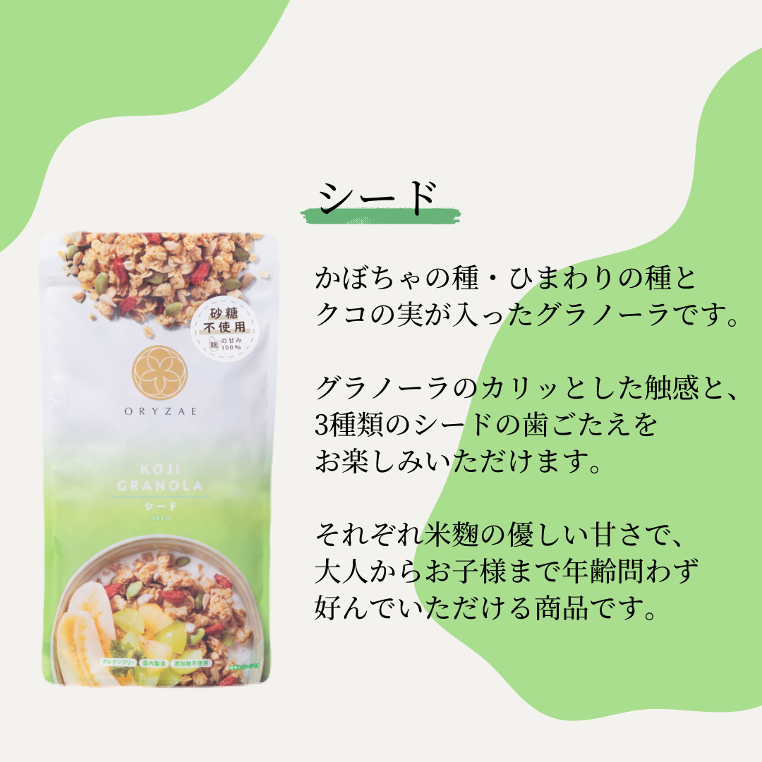 ORYZAEの米麹グラノーラシードは、3種のシードのカリッとした食感がおいしいグラノーラです。