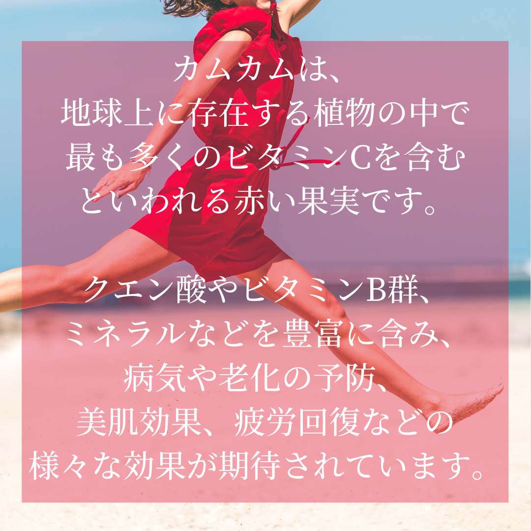 ペルー原産の果実「カムカム」から抽出した天然ビタミンCを、栄養バランスに優れたAFAブルーグリーンアルジーと組み合わせたナチュラルサプリメントです。1回(2カプセル)には50mgの天然のビタミンCを含有しており、美容と健康を多角的にサポートします。