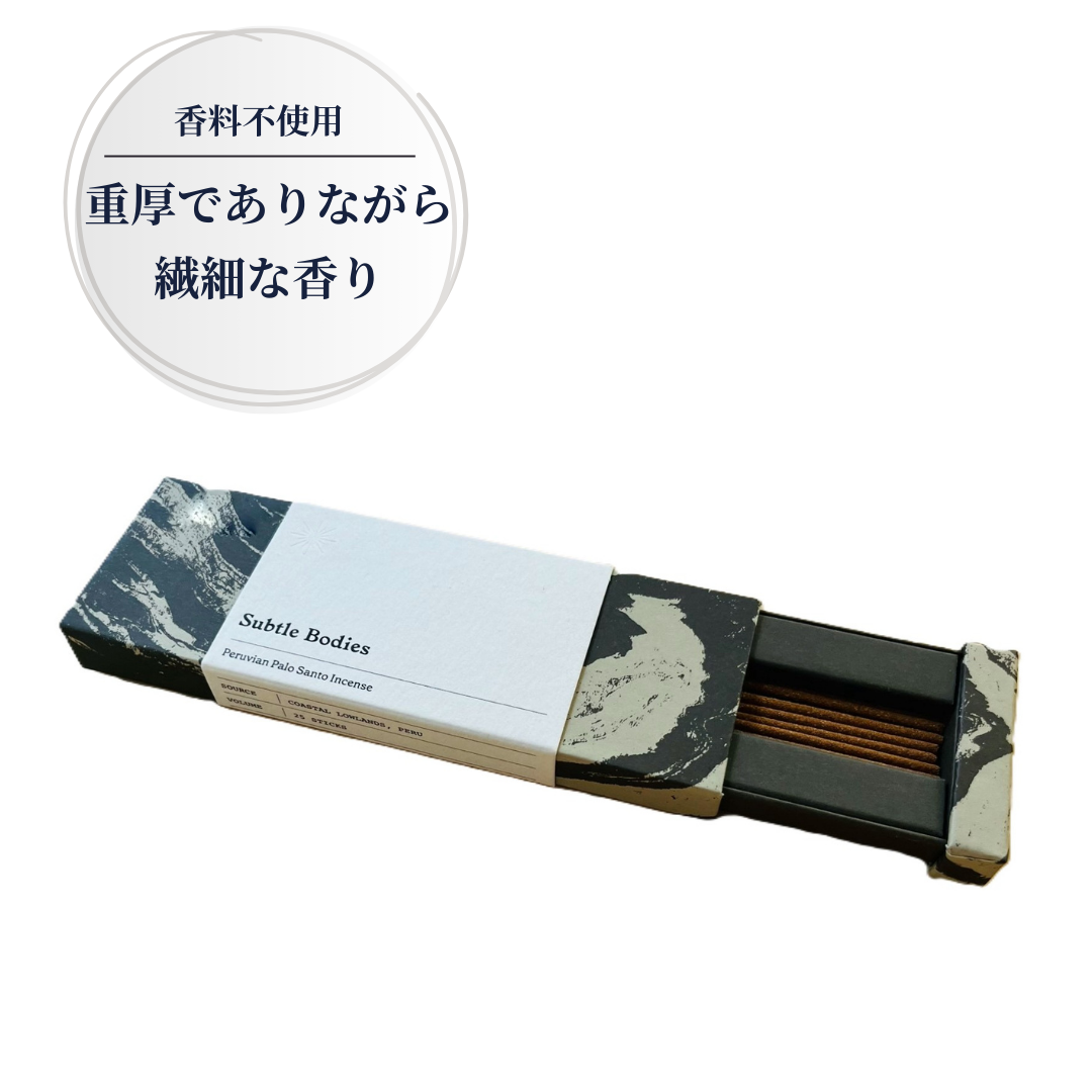 香料を使っていないパロサントのみを使用し、豊富でありながら繊細な香りを放ちます。お香立てなどを使ってお使いいただけますと、よりきれいにお使いいただけます。